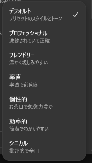 例えば「基本のスタイルとトーン」という項目では、フレンドリーやシニカルなどの話し方の指定が豊富に用意されています。