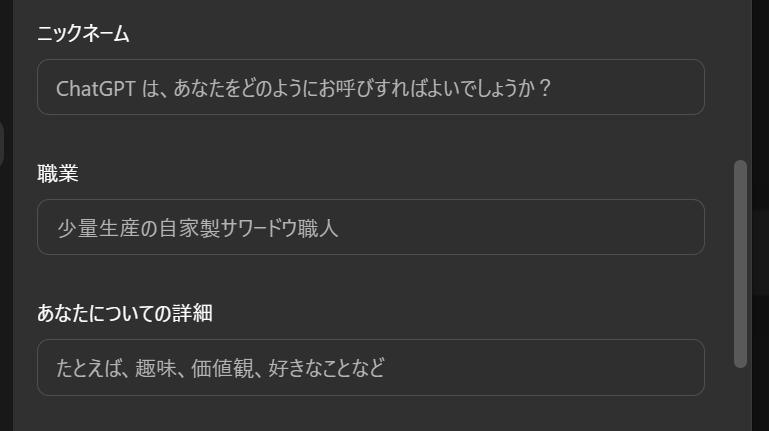 他にも、ニックネームや自分の職業を入力できるだけでなく、ChatGPTに知っておいてほしいことをかなり詳細に書き込むことができます。
